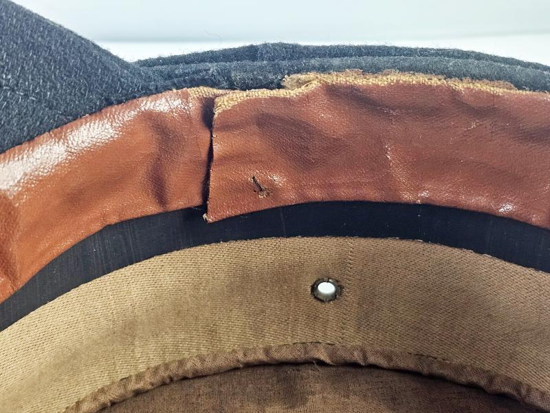 Le bandeau de transpiration est réalisé en toile cirée, typique des coiffures précoces. Le bandeau a perdu toute souplesse avec le temps.