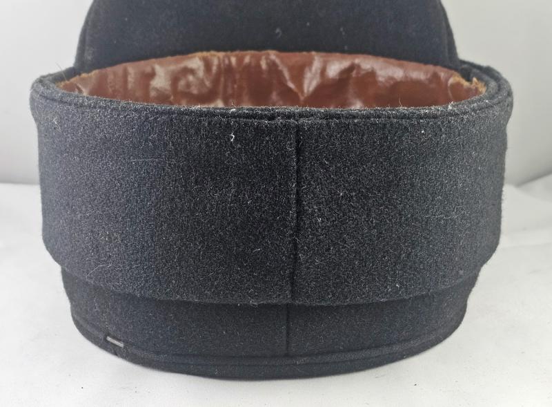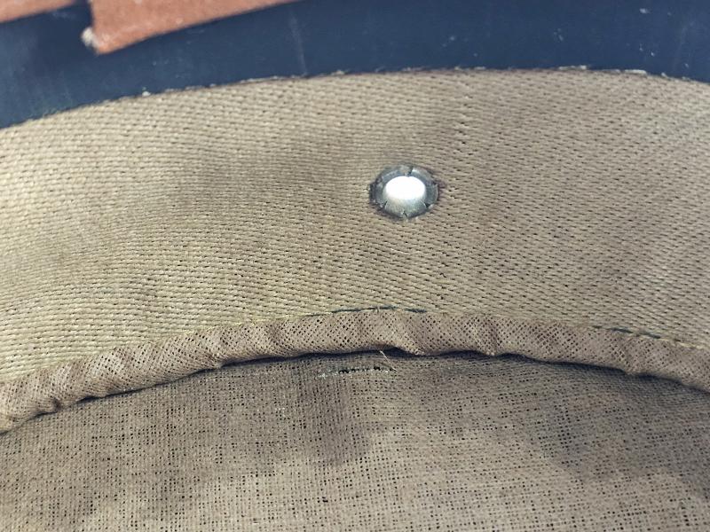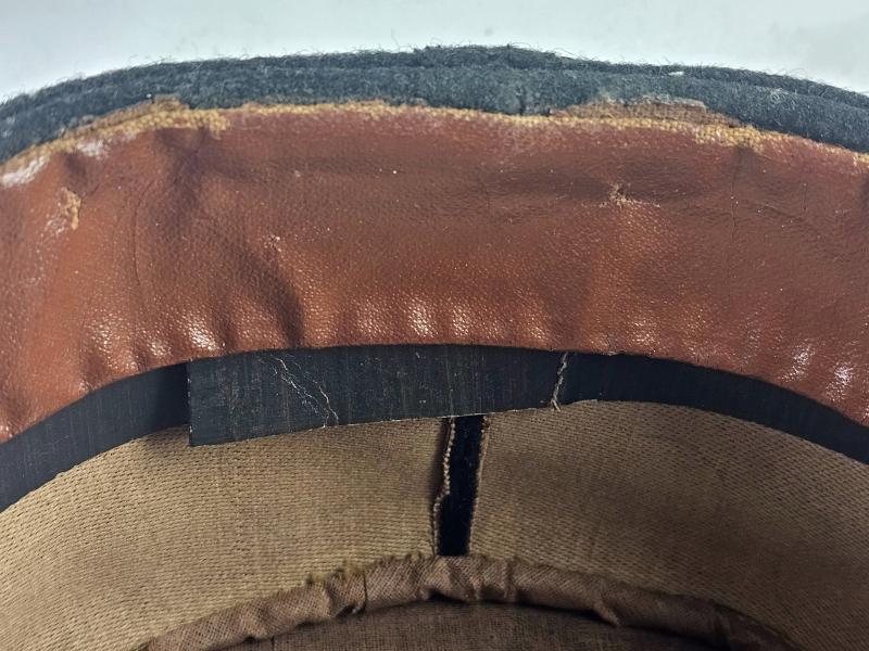 Le bandeau de transpiration est réalisé en toile cirée, typique des coiffures précoces. Le bandeau a perdu toute souplesse avec le temps.